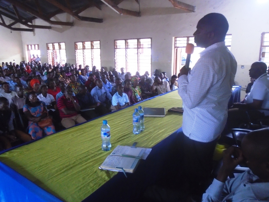 Walimu wa shule za sekondari na msingi za Tarafa ya Itumbili wakimsikiliza Mkuu wa Wilaya ya Magu, Salum Kalli (hayupo pichani) wakati wa mkutano wa walimu uliofanyika kwenye ukumbi wa shue ya Magu sekondari jana.