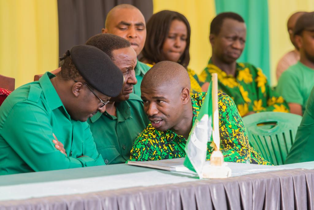 Mwenyekiti wa UVCCM Taifa na mjumbe wa Kamati Kuu ya CCM, Kheri James akibadilishana mawazo na Mwenyekiti wa UVCCM mkoa wa Arusha Omary Lumato walipokuwa Jana katika mkutano wa hadhara uliofanyika kata ya Kiranyi iliopo ndani ya halmashauri ya Arusha DC mkoani Arusha (picha na Woinde Shizza ,ARUSHA)
