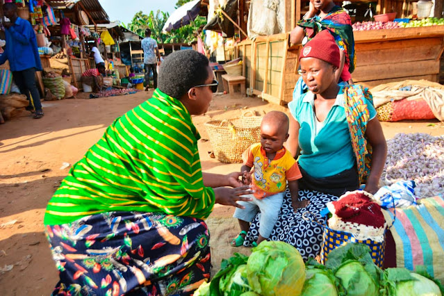 Mama mwenye mtoto ambaye bado ana mnyonyesha akitoa maoni yake kwa Mbunge Mteule wa Viti Maalumu CCM (NGOs) Tanzania Bara Neema Lugangira juu ya uhitaji wa mazingira wezeshi sokoni ambayo ilani ya CCM 2020-2025 imesema