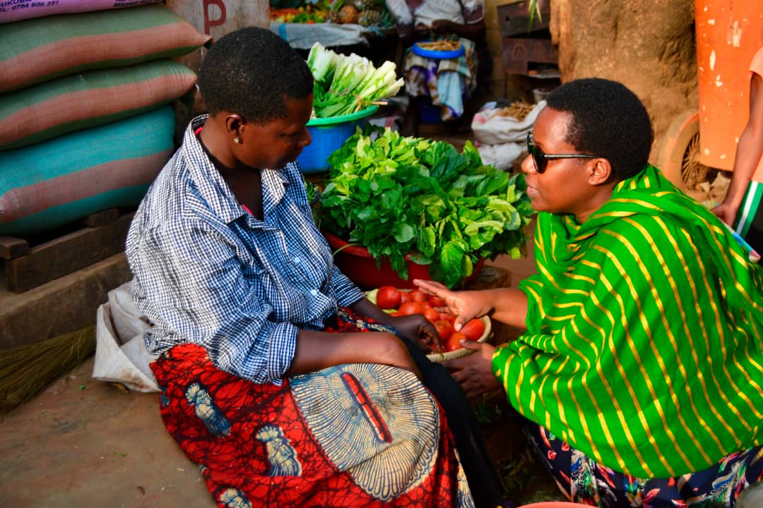 MBUNGE Mteule wa Viti Maalumu CCM (NGOs) Tanzania Bara Neema Lugangira kulia akijadiliana na wanawake wanaouza mboga sokoni juu ya changamoto zao