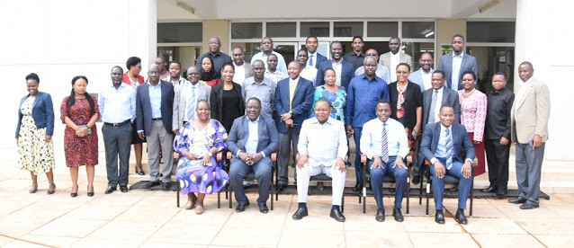 Katibu Mkuu Prof. Riziki Shemdoe akiwa katika picha ya pamoja na Menejimenti ya wizara mara baada ya ufunguzi wa kikao kazi cha mapitio ya sera ya Viwanda vidogo na biashara ndogo .