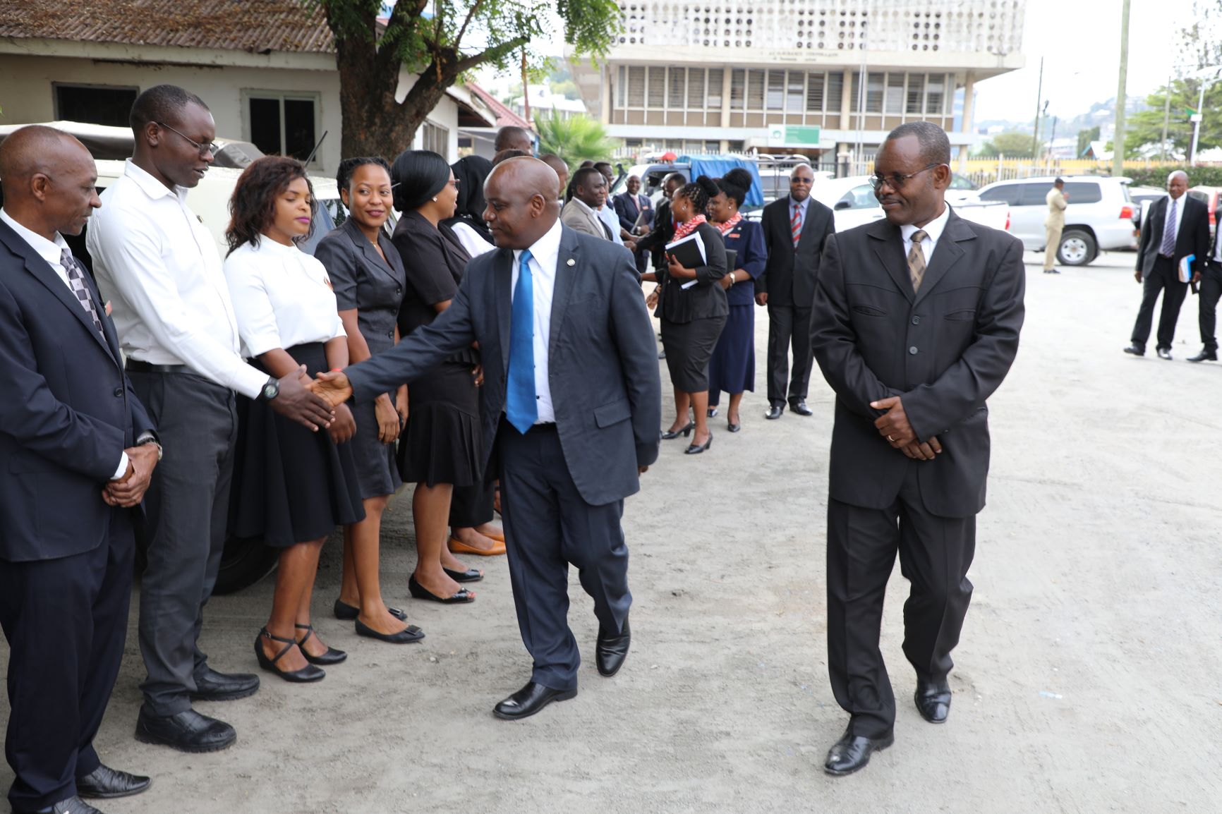 Jaji Kiongozi wa Mahakama Kuu ya Tanzania Mhe.Dkt.Eliezer Feleshi akiwasili Mahakama Kuu Kanda ya Mwanza n Kusalimiana na Watumishi katika Siku ya kwanza ya ziara yake kwenye kanda hiyo.Kulia ni Jaji Mfawidhi wa Kanda ya Mwanza Mhe.Sam Rumanyika