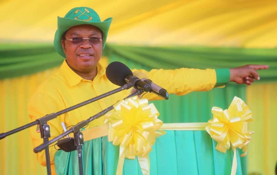 Mjumbe wa Kamati Kuu ya Halmashauri Kuu ya Taifa ya CCM, Kassim Majaliwa akimwombea kura mgombea Urais kwa tiketi ya CCM, Rais Dkt. John Pombe Magufuli katika mkutano wa kampeni aliouhutubia kwenye uwanja wa CCM Sabasaba, Masasi Oktoba 21, 2020.