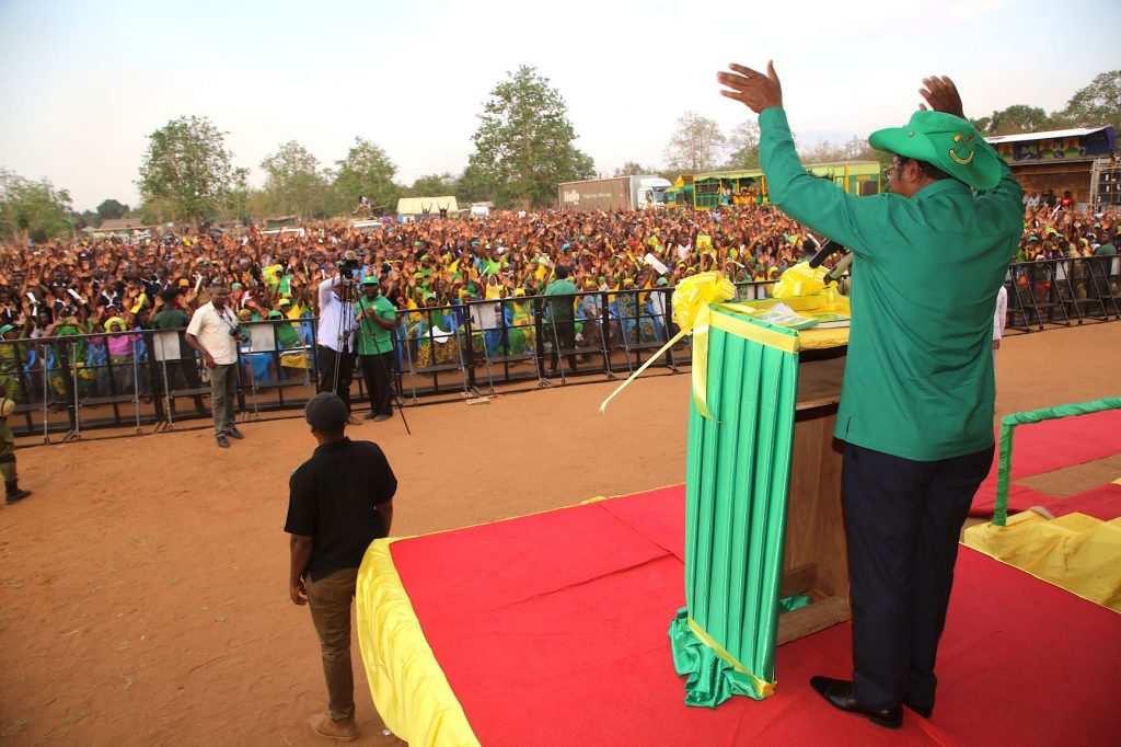 Msanii, Kala Geremiah akiimba katika mkutano wa Kampeni uliohutubiwa na Mjumbe wa Kamati Kuu ya Halmashauri Kuu ya Taifa ya CCM, Kassim Majaliwa kwenye uwanja wa Mpira wa njenga uliopo Ndanda wilayani Masasi