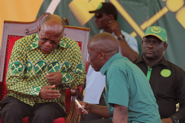 Mgombea Urais wa Jamhuri ya Muungano wa Tanzania kwa tiketi ya Chama cha Mapinduzi CCM Rais Dk John Pombe Magufuli akiteta jambo na Katibu wa NEC Itikadi na Uenezi Ndugu Humphrey Polepole.