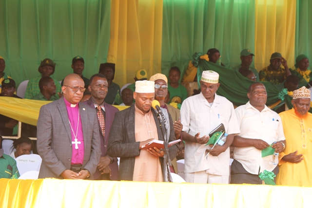 Viongozi mbalimbali wakishiriki katika maombi kwenye mkutano huo uliofanyika Mwanga.