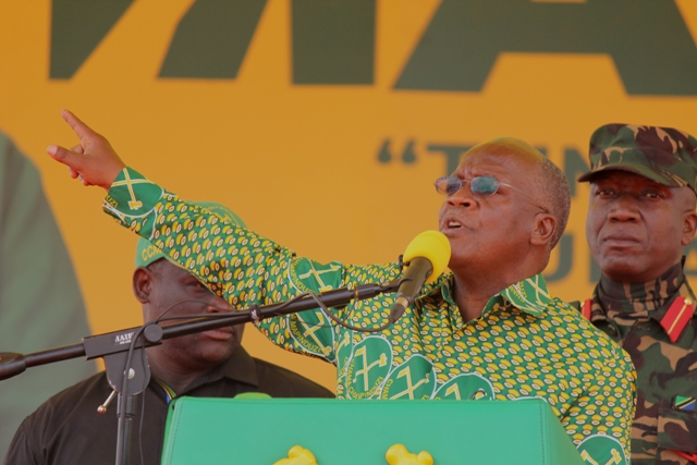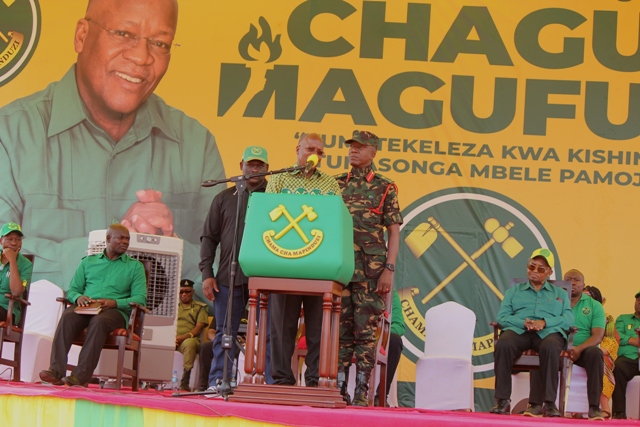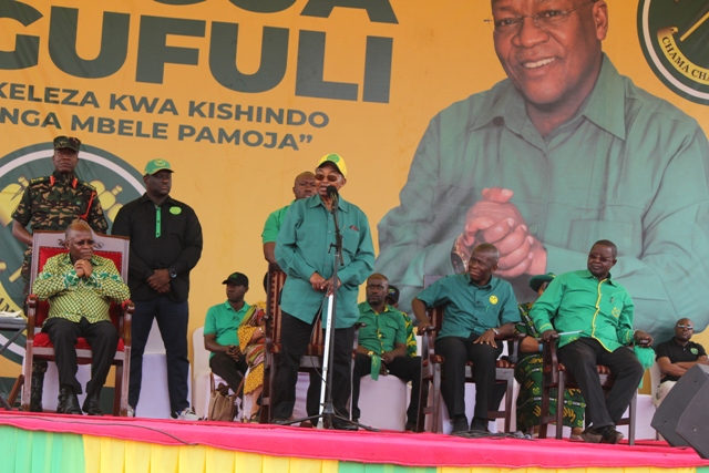 Mgombea Urais wa Jamhuri ya Muungano wa Tanzania kwa tiketi ya Chama cha Mapinduzi CCM Rais Dk John Pombe Magufuli akizungumza na wananchi katika mkutano wa kampeni za CCM uliofanyika mjini Mwanga mkoani Kilimanjaro akiwa njiani kuelekea Moshi mjini leo Jumatano Oktoba 21,2020.