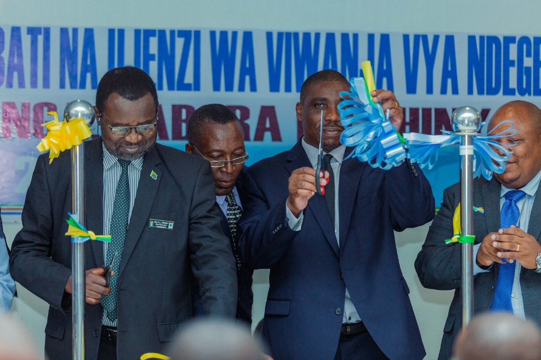 Katibu Mkuu Wizara ya Fedha na Mipango, Bw. Doto James (wa tatu kulia), akikata utepe ikiwa ni alama ya kuzindua rasmi ujenzi, ukarabati na upanuzi wa viwanja vinne vya ndege vya Shinyanga, Tabora, Sumbawanga na Kigoma, utakaogharimu Euro milioni 50 sawa na Sh. bilioni 136.85 zikiwa ni mkopo nafuu kutoka Benki ya Uwekezaji ya Ulaya (EIB), katika ukumbi wa Benki Kuu Tanzania (BoT), jijini Dar es Salaam. Kushoto ni Mtendaji Mkuu wa Wakala wa Barabara Tanzania (TANROADS), Mhandisi Patrick Mfugale, Mkurugenzi wa Miundombinu TAMISEMI Mhandisi Gilbert Mwoga na Kaimu Mkurugenzi Mkuu Mamlaka ya Viwanja vya Ndege -TAA, Bw. Hamisi Amiri.