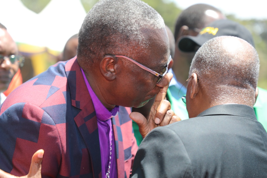 Magufuli akinong’onezwa jambo na Askofu Dkt Frederick Shoo,