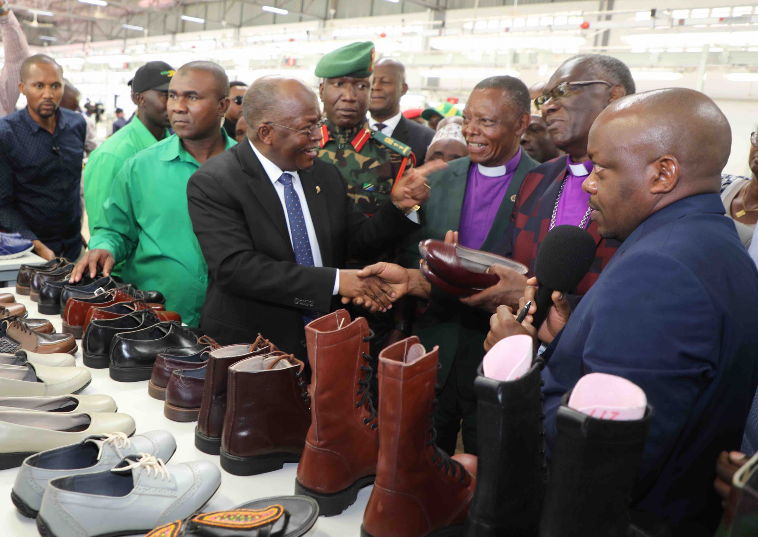 Pombe Magufuli akinunua viatu kwa ajili ya mke wa Askofu Dkt Frederick Shoo, Mkuu wa Kanisa la Kiinjili la Kilutheri. Tanzania (KKKT) na Mkuu wa KKKT Dayosisi ya Kaskazini, mara baada ya kufungua rasmi Kiwanda cha Bidhaa za Ngozi cha Kilimanjaro Leather Industries C. Ltd. Gereza la Karanga mjini Moshi Alhamisi Oktoba 22, 2020