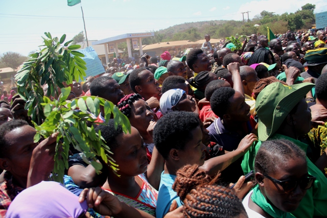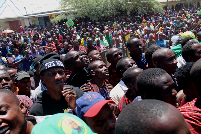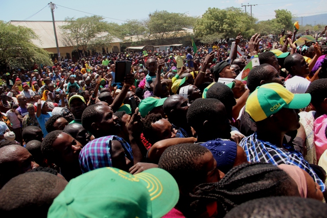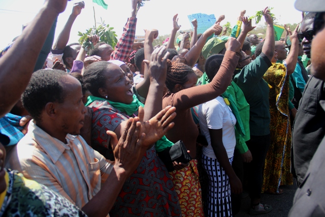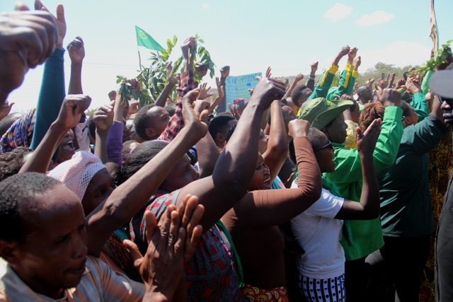 Wananchi wakishangilia wakati Rais Dk. John Pombe Magufuli akizungumza na wananchi wa kata ya Rotia wilayani Karatu.