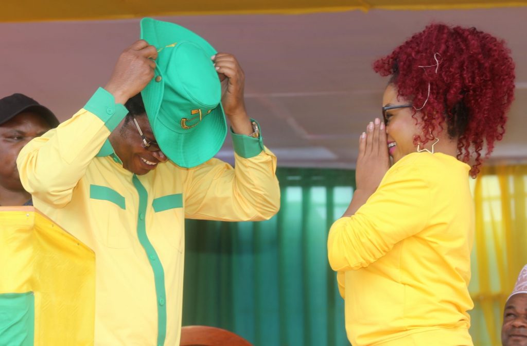Mjumbe wa Kamati Kuu ya Halmashauri Kuu ya Taifa ya CCM, Kassim Majaliwa akivua kofia yake ya CCM ili amvishe Msanii Babby Madaha katika mkutano wa kampeni aliouhutubia kwenye uwanja wa Ujenzi Liwale