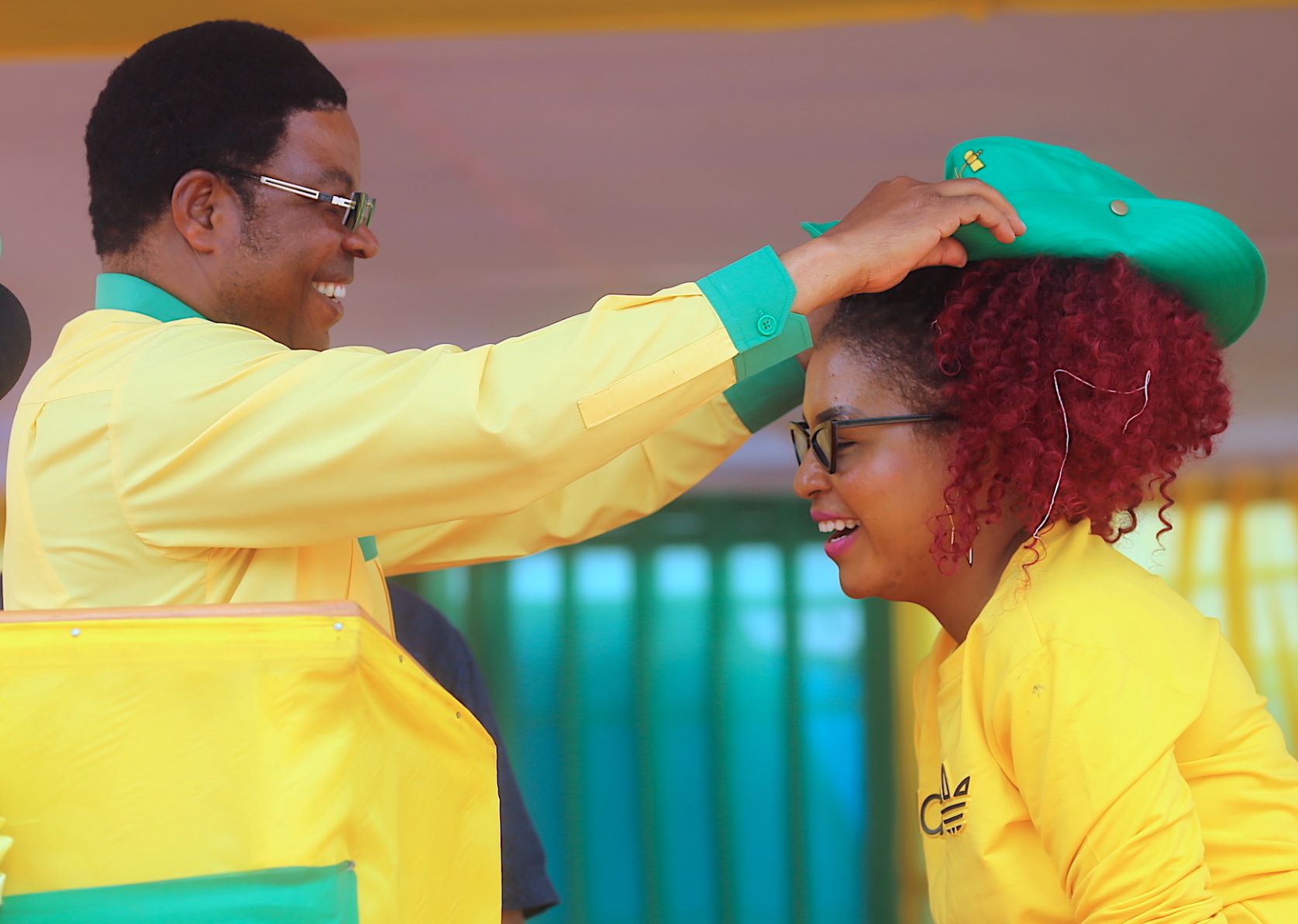 Mjumbe wa Kamati Kuu ya Halmashauri Kuu ya Taifa ya CCM, Kassim Majaliwa akimvisha kofia ya CCM Msanii, Baby Madaha katika mkutano wa kampeni aliouhutubia kwenye uwanja wa Ujenzi Liwale,