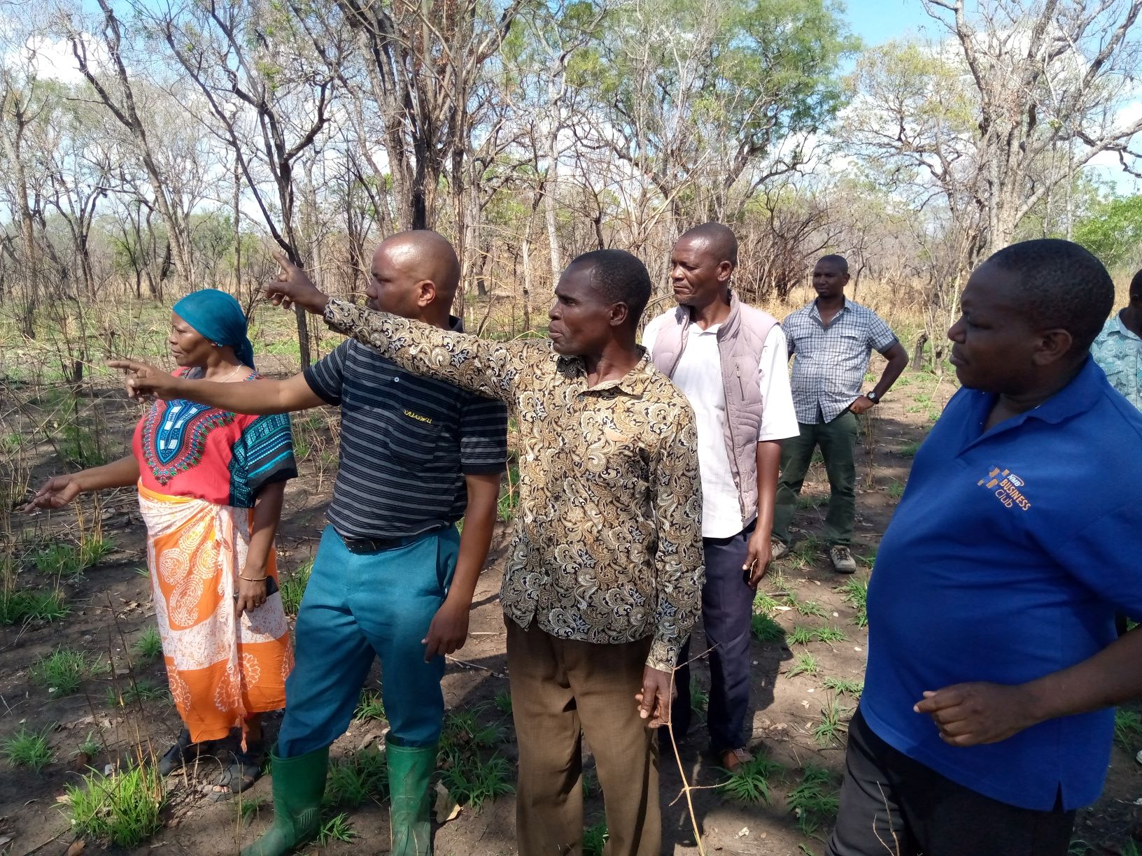 Mwenyekiti wa kijiji cha Makande kata ya Lukumbule wilayani Tunduru Silaju Said aliyenyoosha mkono katikati akiwaonesha baadhi ya wataalam wa halmashauri ya wilaya ya Tunduru Afisa kilimo anayeshughulikia mazao Gallus Makwisa wa kwanza kulia,afisa ushirika George Bisan wa pili kushoto na mjumbe wa chama kikuu cha ushirika Tamcu Ltd Zainabu Yassin.