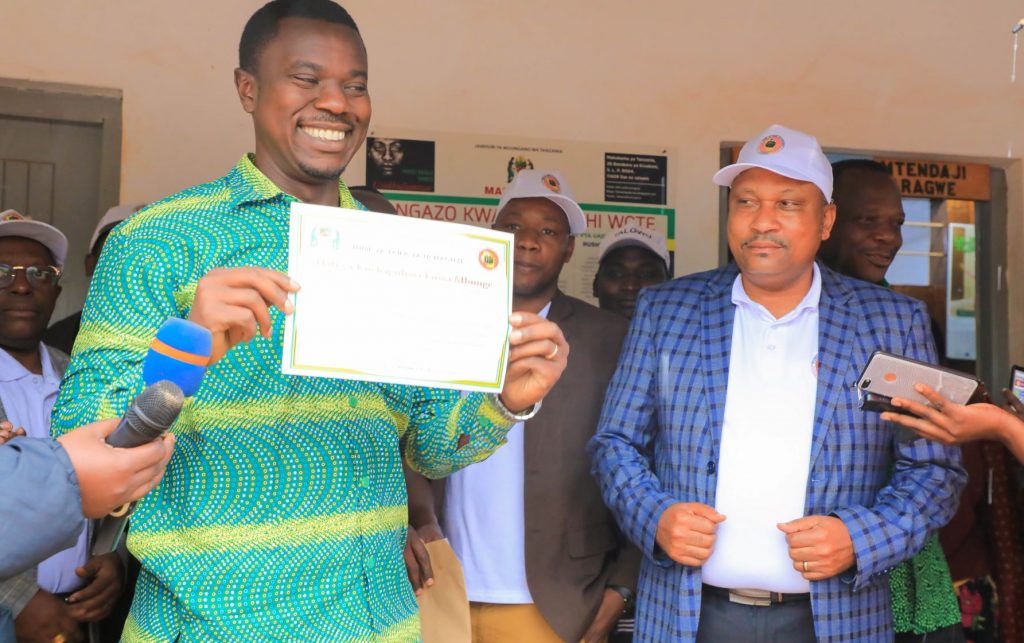 Aliyekuwa Mgombea ubunge jimbo la Karagwe, Innocent Bashungwa(kushoto) akionesha hati ya kuchaguliwa kuwa mshindi wa Uchaguzi wa jimbo la Karagwe baada ya Mkurugenzi Mtendaji wa Halmashauri ya Wilaya ya Karagwe na Msimamizi wa Uchaguzi Jimbo la Karagwe Godwin M. Kitonka kumtangaza Mgombea ubunge jimbo la Karagwe, Innocent Bashungwa kuwa mshindi wa Ubunge jimbo la Karagwe katika uchaguzi mkuu uliofanyika Oktoba 28, 2020. Karagwe, Kagera.