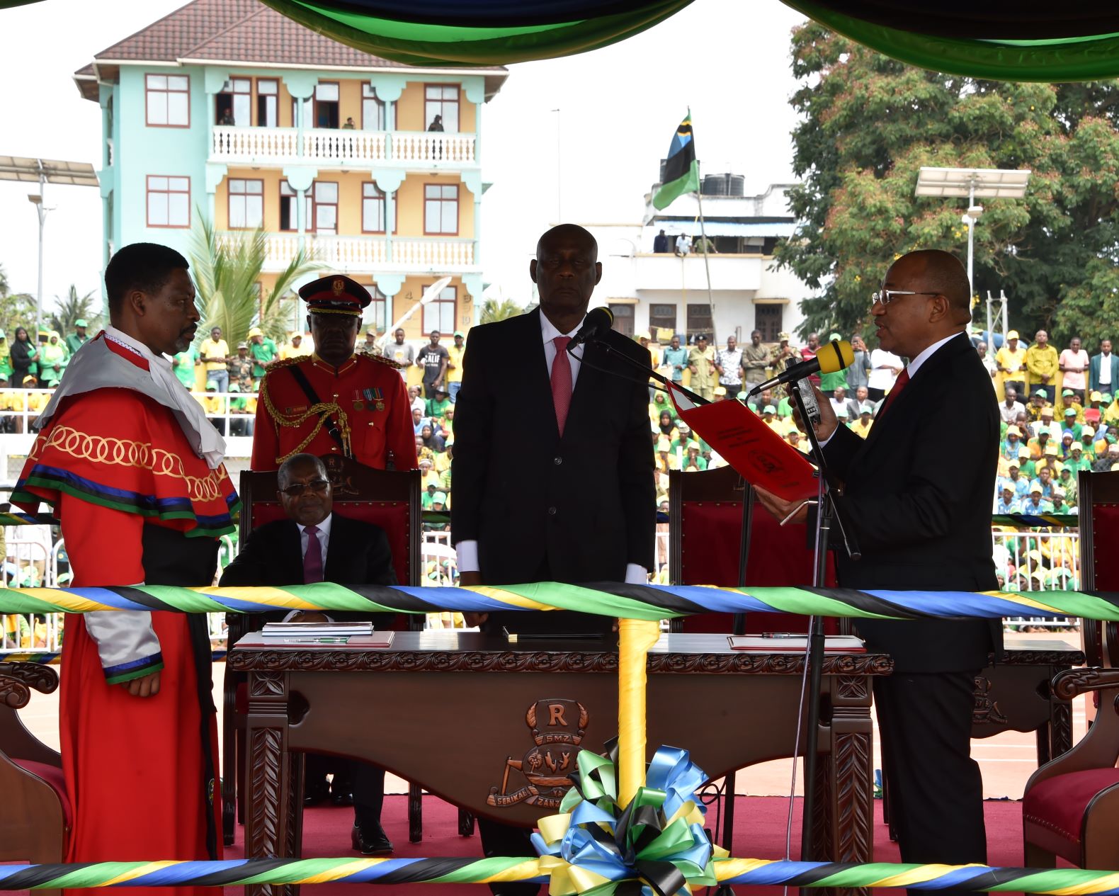 JAJI Mkuu wa Zanzibar Mhe,Omar Othman Makungu akimuapisha Rais wa Zanzibar na Mwenyekiti wa Baraza la Mapinduzi Dkt.Hussein Ali Haasan Mwinyi (kulia) kuongoza Zanzibar kwa awamu ya 8 kuanzia 2020-2025 sherehe za kiapo zilizofanyika leo katika uwanja wa Amaan Studium Jijini Zanzibar.Picha na Ikulu