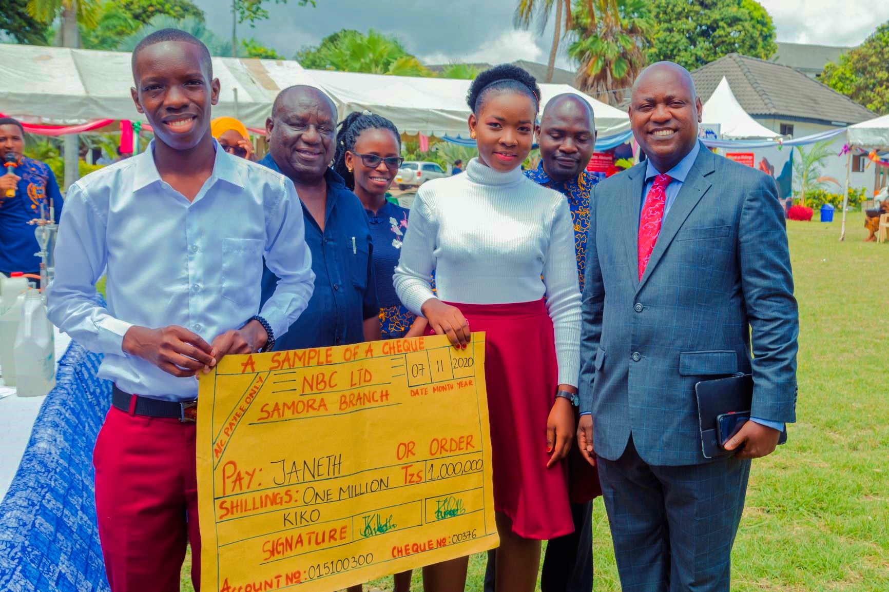 Wahitimu wa kidato cha nne katika Shule ya Sekondari Ghome, wakionyesha mfano wa hundo waliyoitengeneza kwa Mkurugenzi Mtendaji wa NBC, Theobald Sabi (kulia) wakati wa mahafali ya 11 ya shule hiyo.Kulia kwake ni Mkuu wa Shule hiyo Ivon Mbieli na Mkurugenzi wa Shule hiyo, Dk.Emmanuel Malangalila.