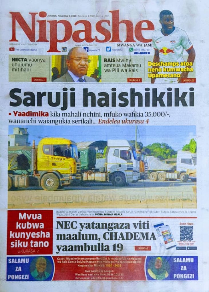 MagazetiPITIA VICHWA VYA HABARI KATIKA MAGAZETI YA LEO NOVEMBA 9,2020 Last updated: 2020/11/09 at 3:13 AM Alex Sonna 5 years ago Share SHARE Alex Sonna November 9, 2020 November 9, 2020 Share this Article Facebook Twitter Email Print Previous Article BINTI WA MIAKA 17 AWASHINDA WAKONGWE MASHINDANO YA GOFU YALIYODHAMNIWA NA BENKI YA CRDB Next Article MAWAKALA WA KONYAGI WAJISHINDIA PIKIPIKI ZA USAMBAZAJI