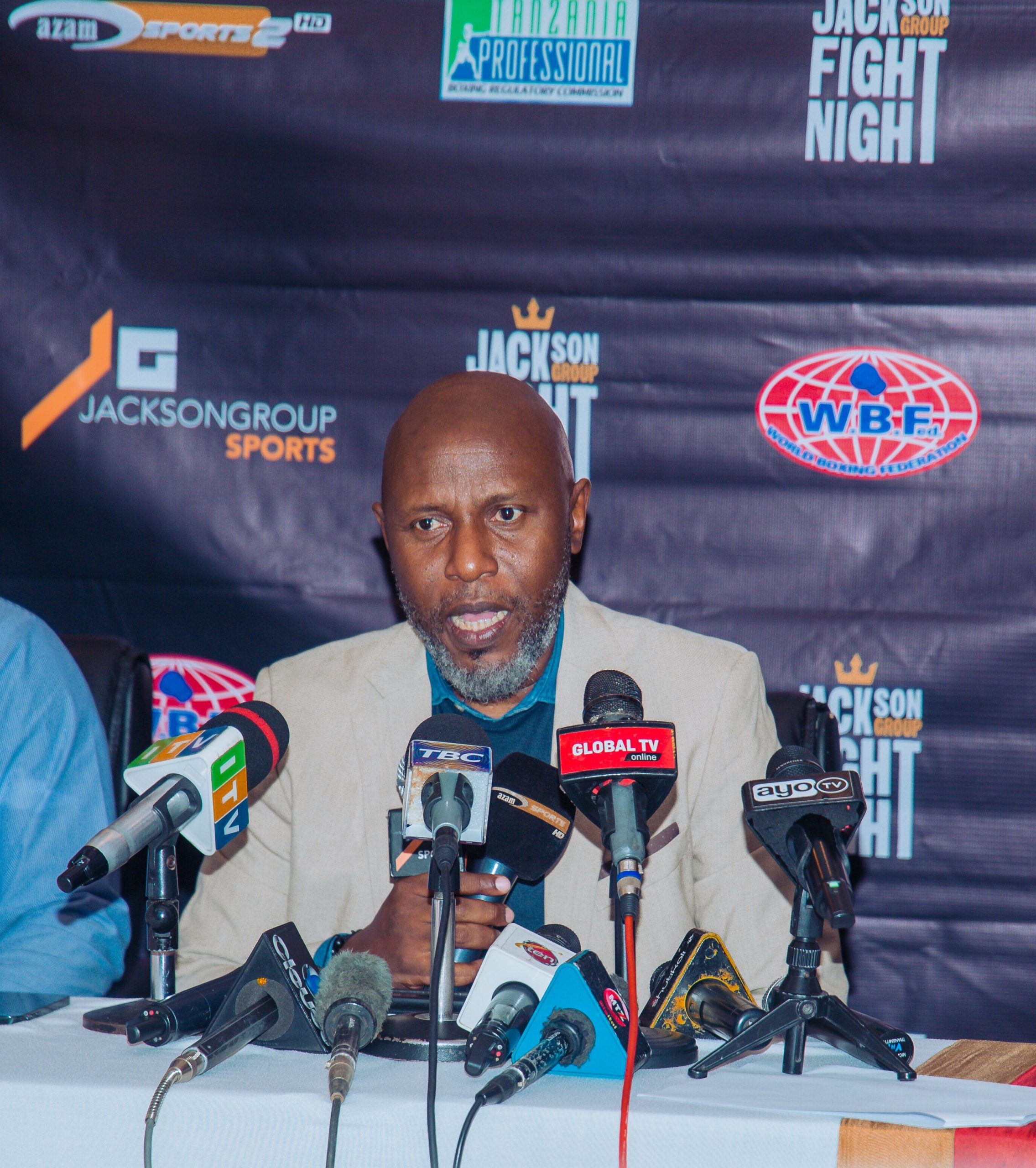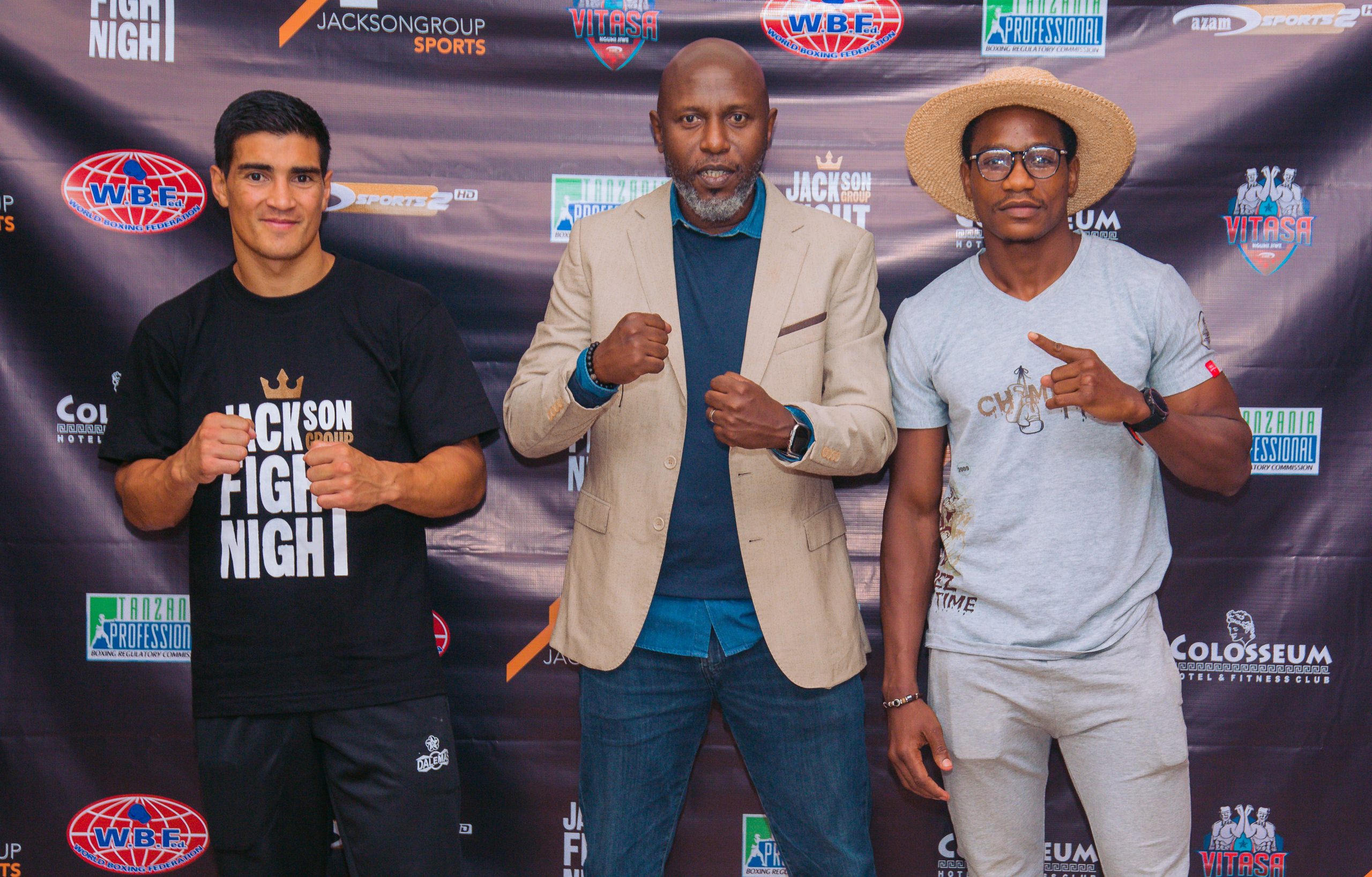 Mkurugenzi Mtendaji wa kampuni ya Jackson Group Sports Kelvin Twissa akiwatambulisha Hassan Mwakinyo na Jose Carlos Paz ambao watawania mkanda wa mabara wa chama cha WBF wa uzito wa super-welter.