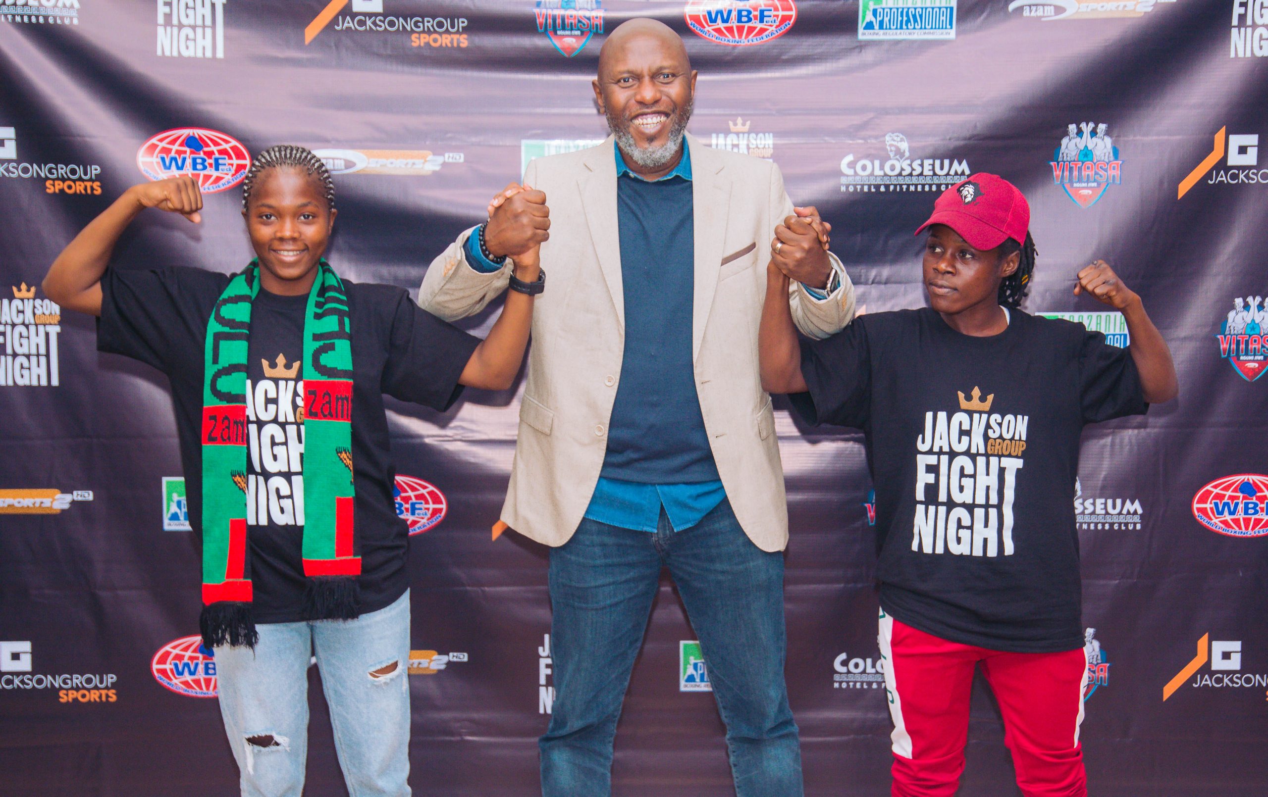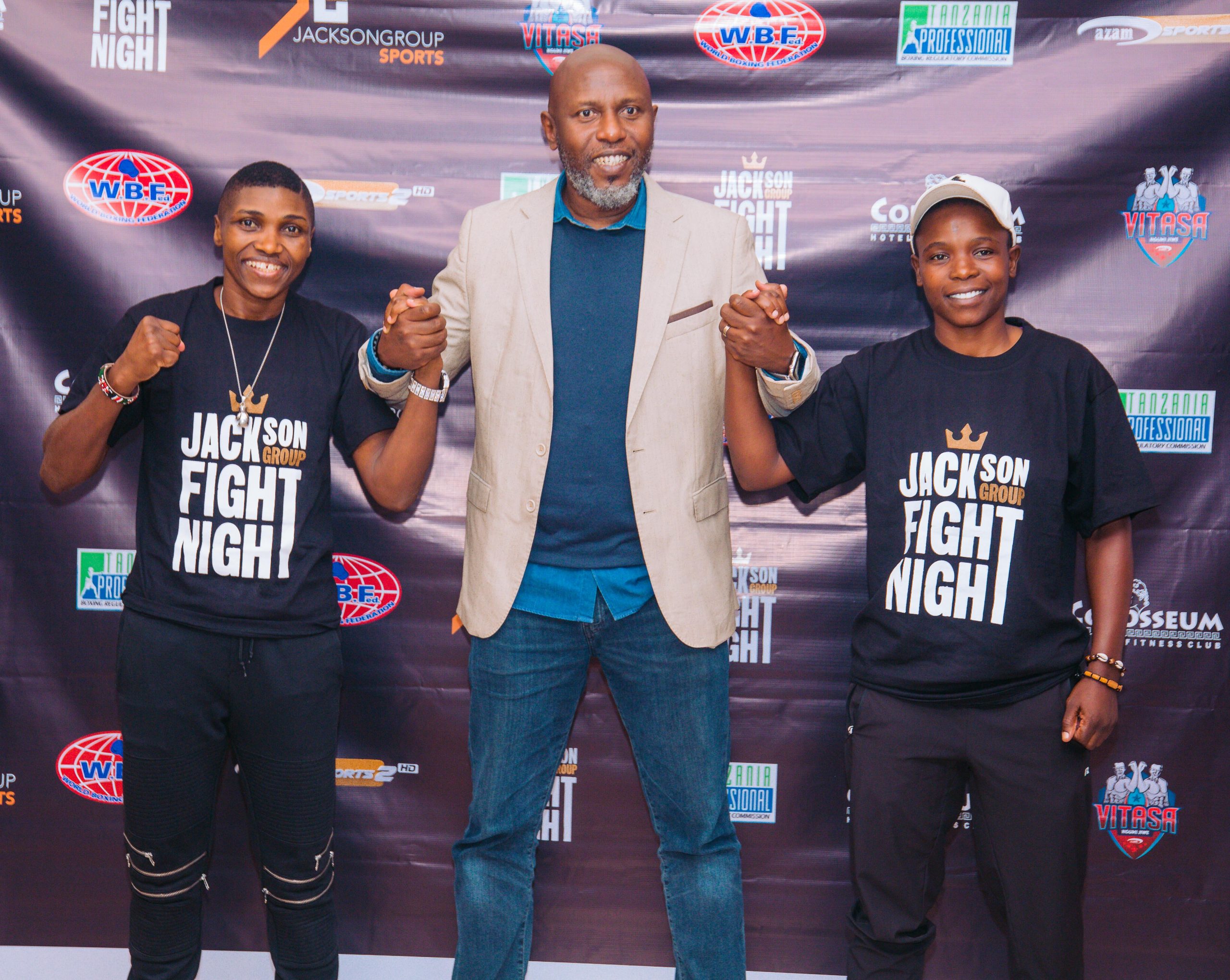 Mkurugenzi Mtendaji wa kampuni ya Jackson Group Sports Kelvin Twissa akiwatambulisha Alice Mbewe wa Zambia (kulia) na Zulfa Macho wa Tanzania.