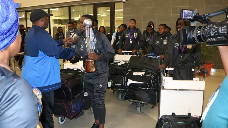 Rais wa Shirikisho la Soka Tanzania (TFF) Wales Karia (aliyebeba kombe) akiwa katika picha ya pamoja na wachezaji wa timu ya Taifa ya wasichana wa chini ya umri wa miaka 17 (U-17) mara baada ya kuwasili Uwanja wa Ndege wa Kimataifa wa Mwalimu Julius Nyerere jijini Dar es salaam wakitokea Afrika Kusini waliposhiriki michuano Baraza la Vyama vya Mpira wa Miguu Kusini mwa Afrika, (COSAFA) na kuibuka mabingwa.