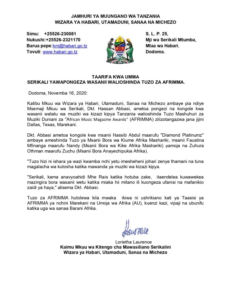 BurudaniSERIKALI YAWAPONGEZA WASANII WALIOSHINDA TUZO ZA AFRIMMA Last updated: 2020/11/17 at 6:23 AM Alex Sonna 5 years ago Share SHARE Alex Sonna November 17, 2020 November 17, 2020 Share this Article Facebook Twitter Email Print Previous Article CAMFED YATOA ELIMU YA AFYA YA UZAZI KWA WASICHANA SINGIDA Next Article UVUVI HARAMU NCHINI UMEPUNGUA KWA ASILIMIA 100 -DKT RASHID