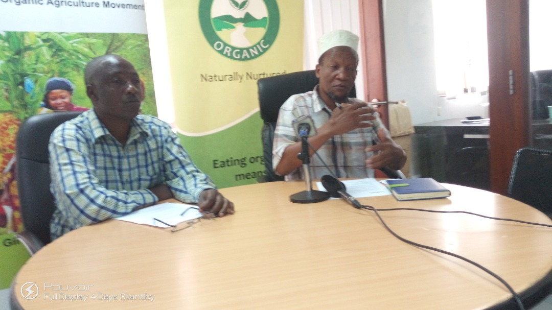 Mkurugenzi Mtendaji wa Shirika Mwavuli Linalosimamia Shughuli za Kilimo Hai Tanzania (TOAM), Bakari Mongo akizungumza na waandishi wa habari kuhusu kongamano la wadau wa kilimo hai linalotarajiwa kufanyika Novemba 23/2020 katika Chuo Kikuu cha Dar es Salaam (UDSM). Kulia ni Mratibu wa Shirika lisilo la Kiserikali linalojishughulisha na Utunzaji wa Bioanuai Tanzania (TABIO), Abdallah Mkindi.Picha na Suleiman Msuya