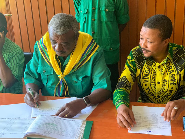 Mwenyekiti wa Jumuiya ya Wazazi ya Chama Cha Mapinduzi (CCM) Taifa, Dk.Edmund Mndolwa, akisaini kitabu cha wageni baada ya kuwasili mkoani Kilimanjaro jana kwa ziara ya kikazi ya siku moja. Kulia ni Mwenyekiti wa Jumuiya hiyo, mkoa humo, Daudi Mrindoko.
