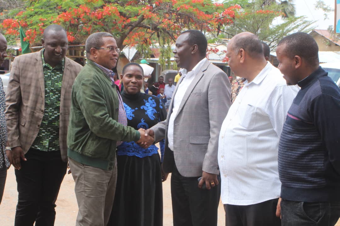 Rais mstaafu wa Nne wa Jamuhuri ya Muungano wa Tanzania, Dkt. Jakaya Mrisho Kikwete, akisalimiana na Mkuu wa Wilaya ya Singida, Paskas Mulagiri. Kutoka kulia ni Mwenyekiti wa Umoja wa Vijana wa Chama Cha Mapinduzi (UVCCM) Mkoa wa Singida, Dk. Denis Nyiraha na Katibu wa Itikadi na Uenezi na Itikadi wa Chama cha Mapinduzi CCM Mkoa wa Singida Ahmed Kaburu.