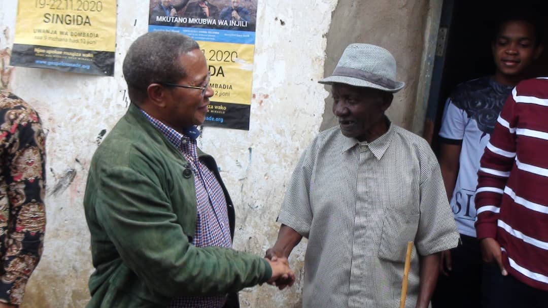 Rais mstaafu wa Nne wa Jamuhuri ya Muungano wa Tanzania, Dkt. Jakaya Mrisho Kikwete, akisalimiana Mzee Andrew ambaye ni mmiliki wa nyumba aliyokuwa akiishi wakati akifanyakazi mkoani Singida.