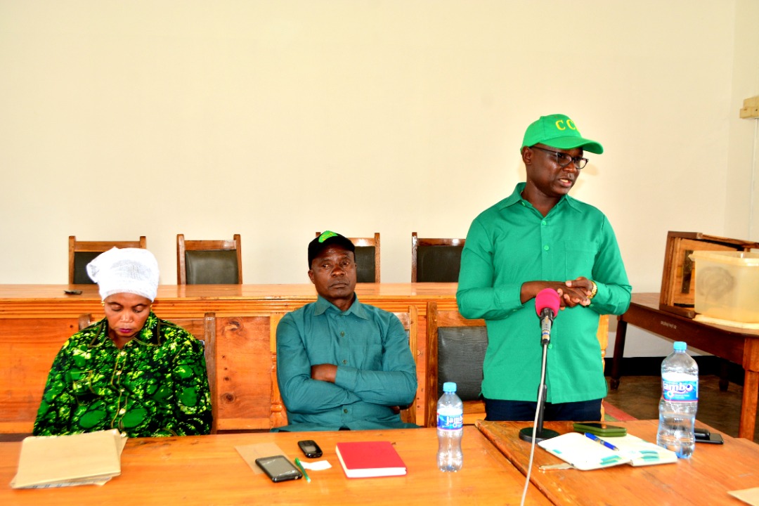 Mwenyekiti wa Chama Cha Mapinduzi wilaya ya Biharamulo Robert Alphonce Malulu aliyesimama akiongea kwenye kikao cha madiwani wa CCM kwaajili ya kumchagua mwenyekiti wa halmashauri ya wilaya hiyo.
