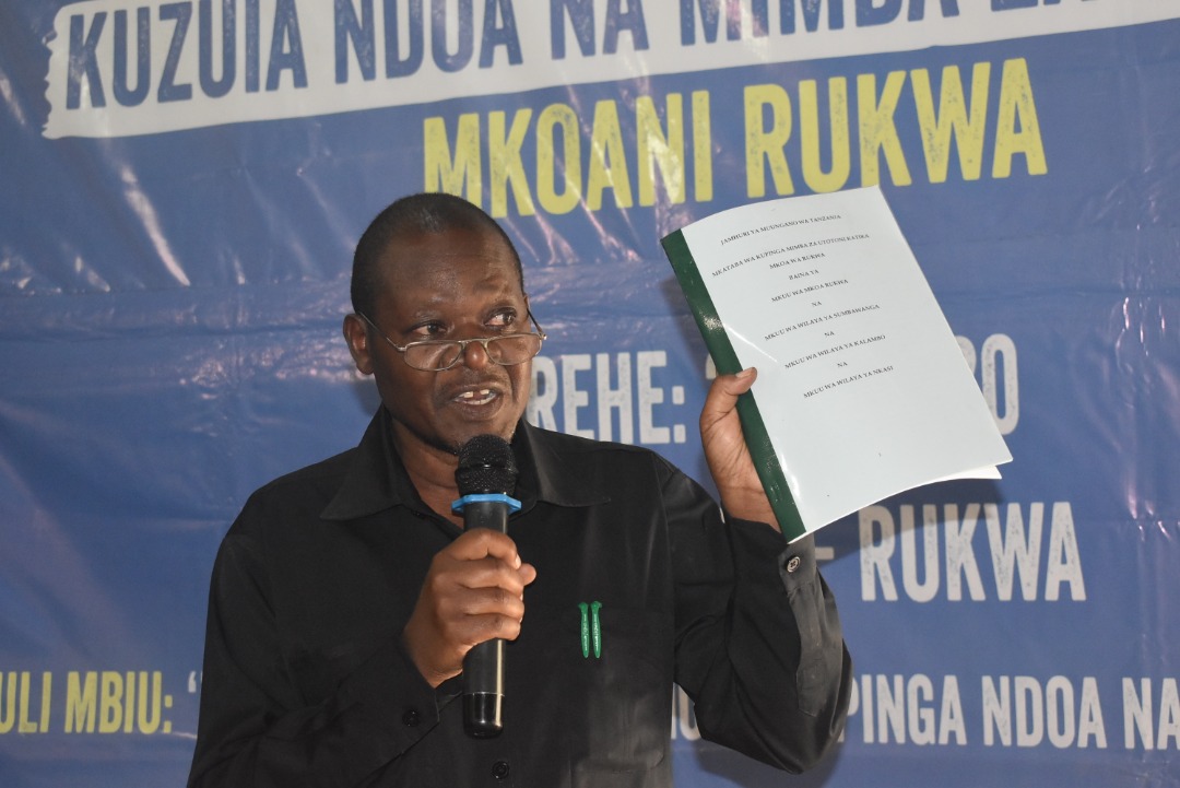 Mkuu wa mkoa wa Rukwa Mh. Joachim Wangabo akiwaonesha Mkakati wa miaka mitano wa Kupambana na Mimba za Utotoni katika Mkoa kwa wadau waliohudhuria kwenye uzinduzi wa mradi wa kuzuia ndoa na mimba za utotoni kabla ya kuzindua mradi huo katika ukumbi wa mikutano wa ofisi ya Mkuu wa mkoa.
