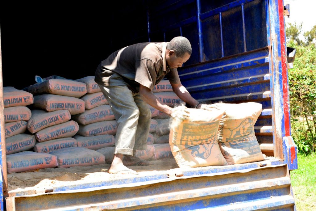 Mifuko ya saruji iliyotolewa na mbunge wa jimbo la Biharamulo Magharibi Eng. Ezra Chiwelesaa pamoja na mwenyekititi wa UWT mkoa wa Kagera ikishushwa katikaofisi za halmashauri ya wilaya Biharamulo.