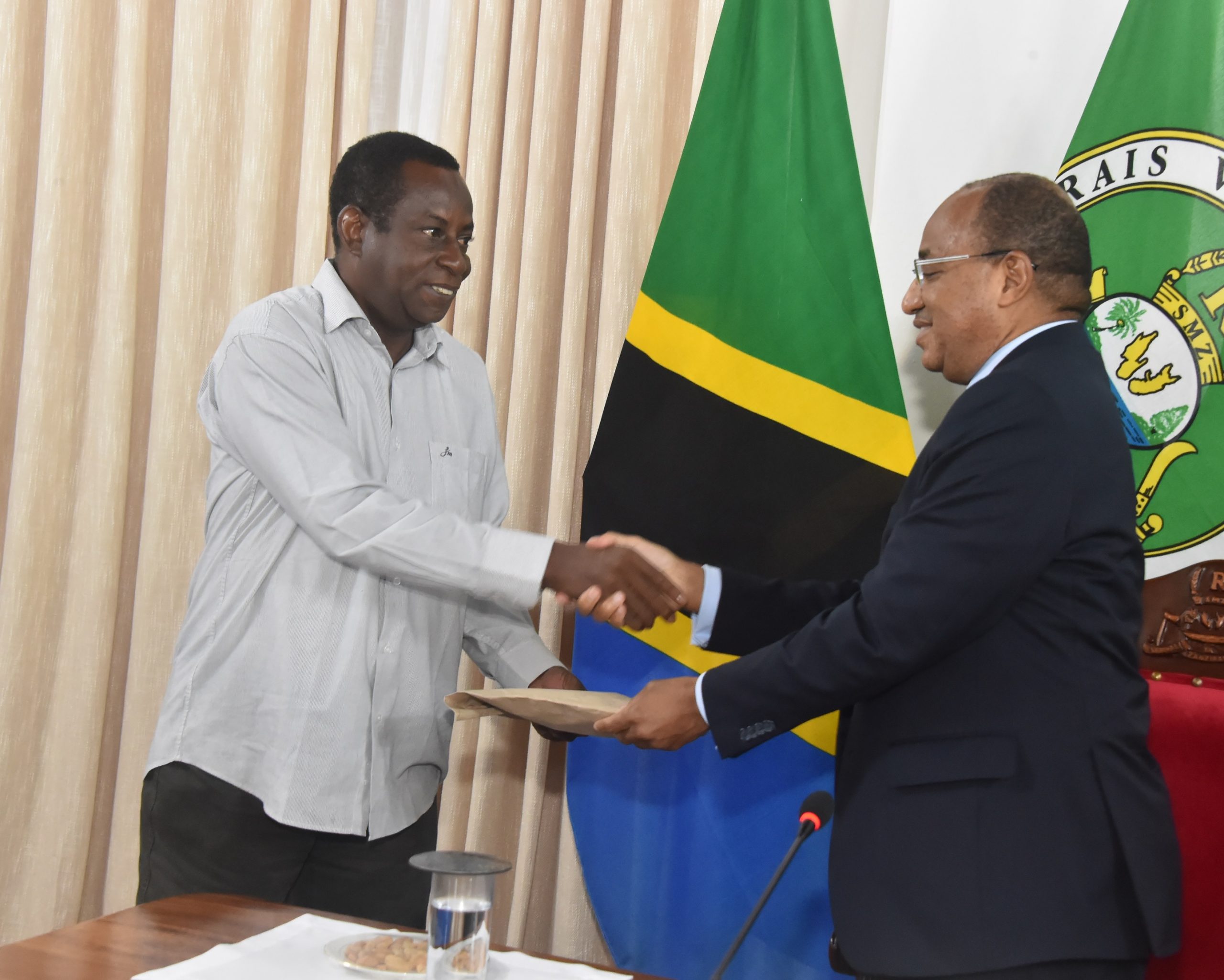 Rais wa Zanzibar na Mwenyekiti wa Baraza la Mapinduzi Dk.Hussein Ali Mwinyi (kulia)akimkabidhi fedha tasilim za KitanzaniaMillioni Thalathini na Tano Mwenyekiti wa Timu ya Mpira wa Miguu ya Mlandege Nd.Ali Khatib Dai,ambapo Timu hiyo inatarajiwa kusafiri kwenda nchini Tunis,Tunisia katika mashindano ya Club Bingwa Barani Afrika na Timu ya CS SFAXIEN ya Tunisia .[Picha na Ikulu].02/12/2020.