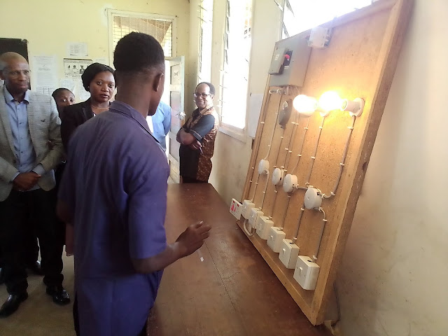 Mwanachuo wa fani ya umeme majumbani, Masome Stephano, akionyesha namna alivyokidhi vigezo vya kuwa fundi wa taaluma hiyo mbele ya wageni waliofika chuoni hapo jana.