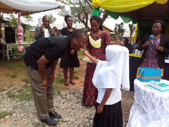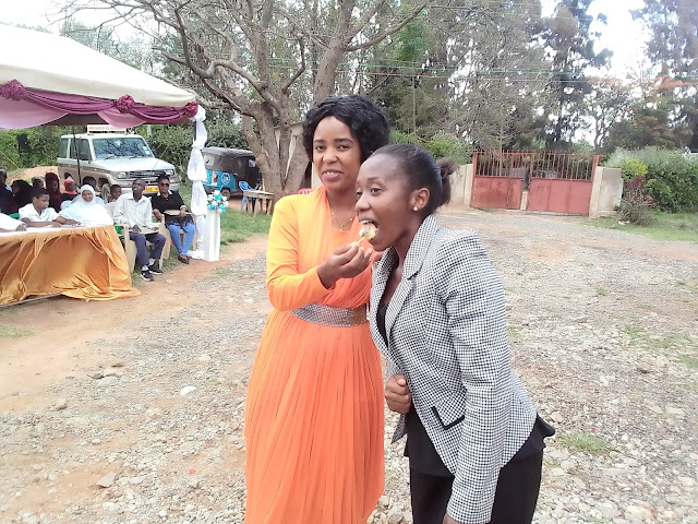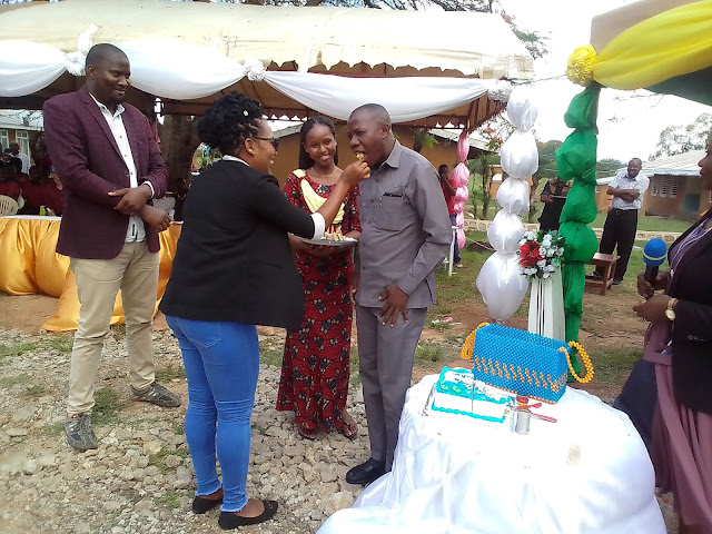 Katibu wa Wazazi Chama Cha Mapinduzi  mkoa wa Singida, Ibrahim Mpwapwa, akilishwa kipande cha keki na mhitimu Edna Alex, kama shukrani kwa mchango wake kukamilisha kufanyika kwa mahafali hayo.