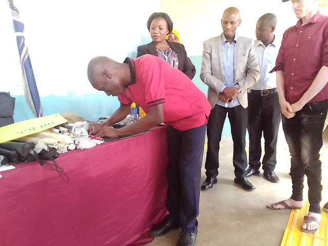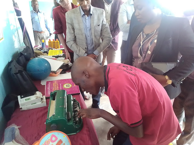 Mwanachuo aliyebobea kwenye fani ya maandishi ya Nukta Nundu, Malingira Mathias akionyesha umahiri wake kwa kuandika jina la mgeni rasmi kupitia mashine ya Braille.