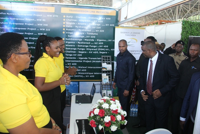 Johary Kachwamba Meneja Uhusiano Shirika la Umeme Tanzania TANESCO akielezea jambo kwa umakini huku akisikilizwa na wageni waliotembelea banda hilo pamoja na wafanyakazi wenzake.