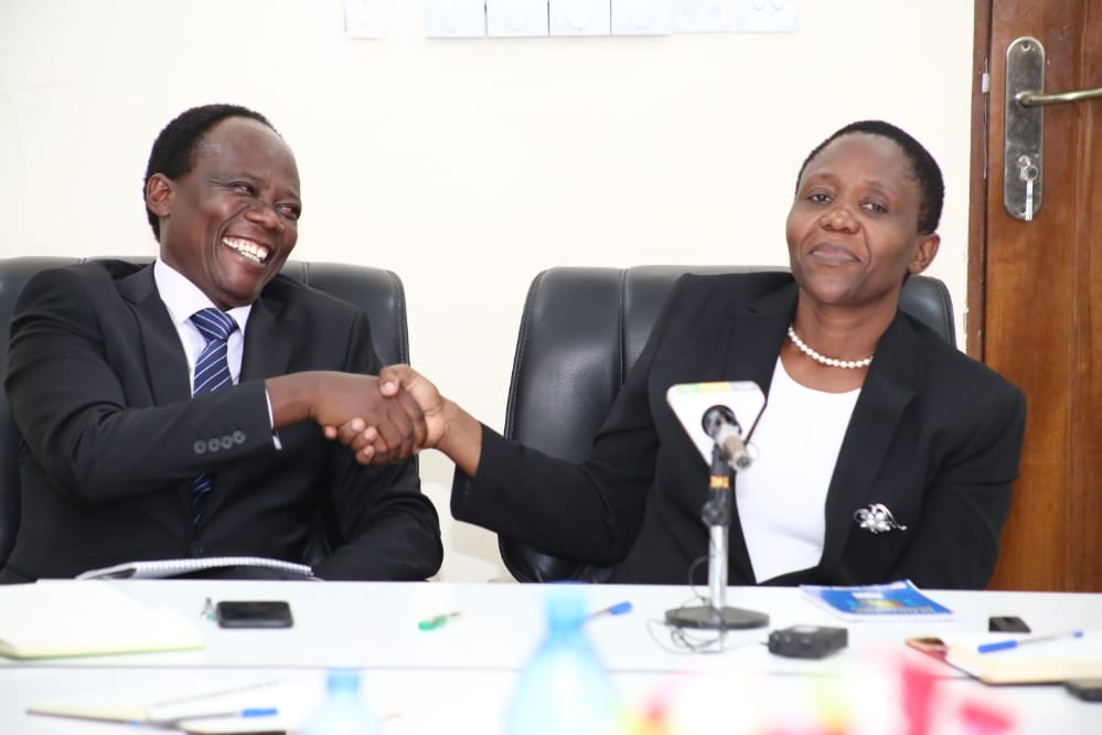 Waziri wa Afya, Maendeleo ya Jamii, Jinsia, Wazee na Watoto Dkt. Dorothy Gwajima akifurahia jambo na Naibu Waziri wa Afya, Maendeleo ya Jamii, Jinsia, Wazee na Watoto Dkt. Godwin Mollel baada ya kuwasiri katika ofisi za Wizara ya Afya Jijini Dodoma.