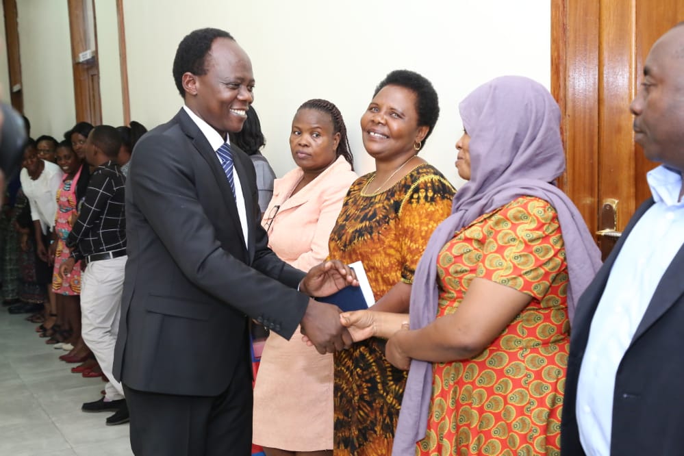 Katibu Mkuu Wizara ya Afya, Maendeleo ya Jamii, Jinsia, Wazee na Watoto Prof. Mabula Mchembe akisisitiza jambo mbele ya Watumishi wa Afya wakati wa mapokezi ya Waziri wa Afya, Maendeleo ya Jamii, Jinsia, Wazee na Watoto na Naibu Waziri wake katika ofisi za Wizara ya Afya Mtumba Jijini Dodoma.