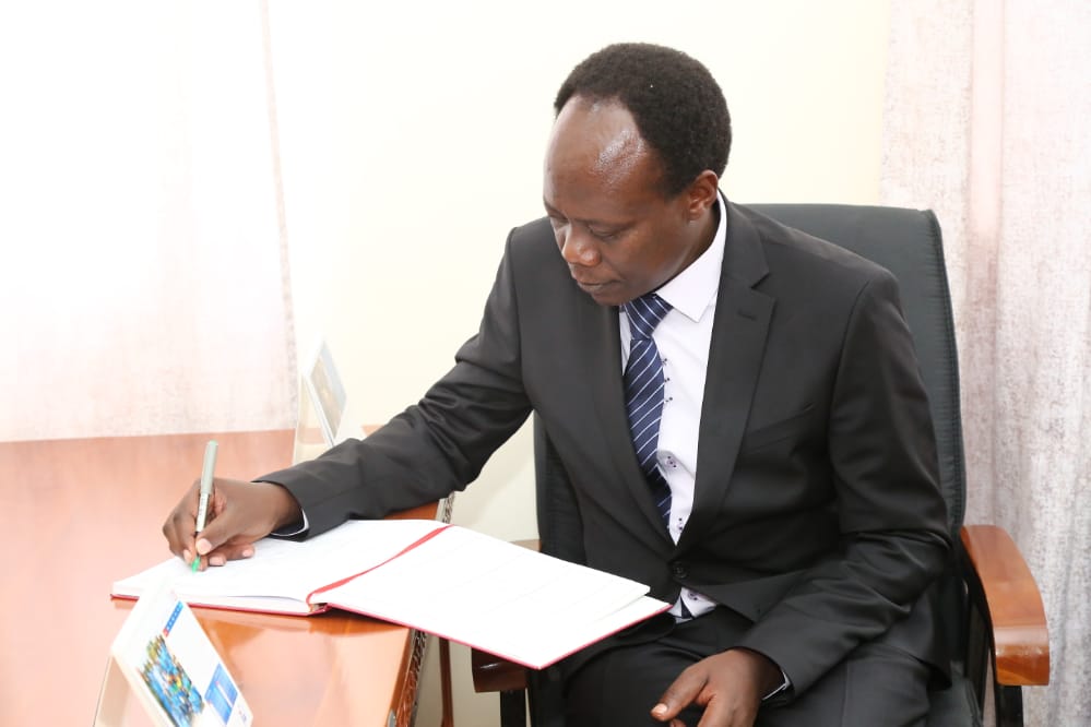 Naibu Waziri wa Afya, Maendeleo ya Jamii, Jinsia, Wazee na Watoto Dkt. Godwin Mollel akisaini kitabu baada ya kuwasiri katika ofisi za Wizara ya Afya Jijini Dodoma.