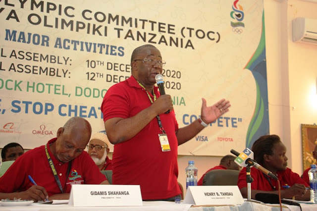 (TOA), Gidamis Shahanga akizungumza kabla ya kumkaribisha mgeni rasmi, Makamu wa Rais wa Kamati ya Olimpiki Tanzania
