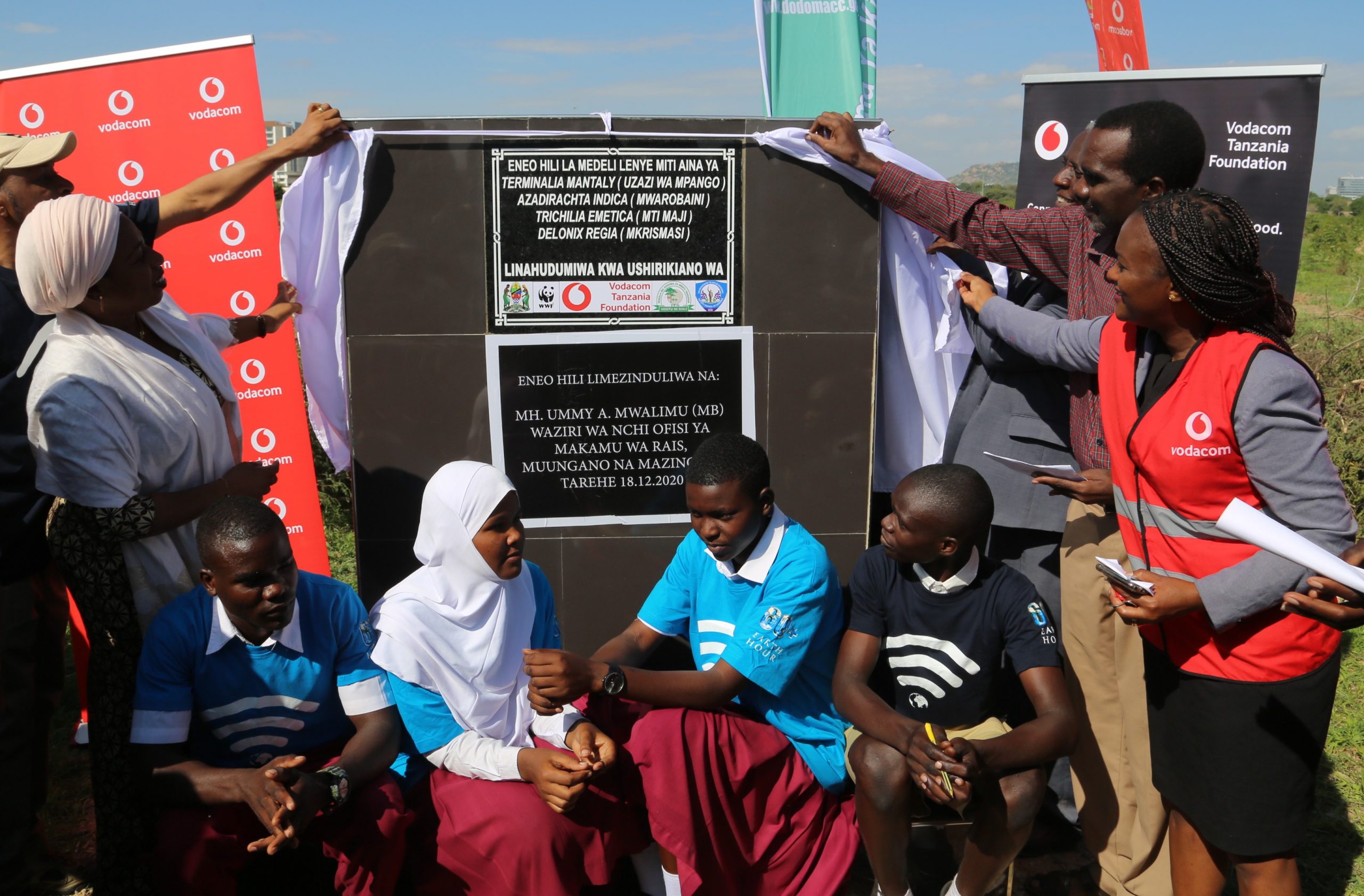 Waziri wa Nchi Ofisi ya Makamu wa Rais (Muungano na Mazingira),Ummy Mwalimu (kushoto) akifunua kitambaa kwa kushirikiana na Mkuu wa Mauzo wa Vodacom Tanzania PLC Kanda ya Kati, Grace Chambua (wa kwanza kulia) kuashiria uzinduzi rasmi wa bustani ya msitu wa miti ya kupandwa eneo la Medeli Jijini Dodoma jana, Jiji limetenga eneo hilo lenye ukubwa wa ekari 10 kwa ajili ya msitu huo