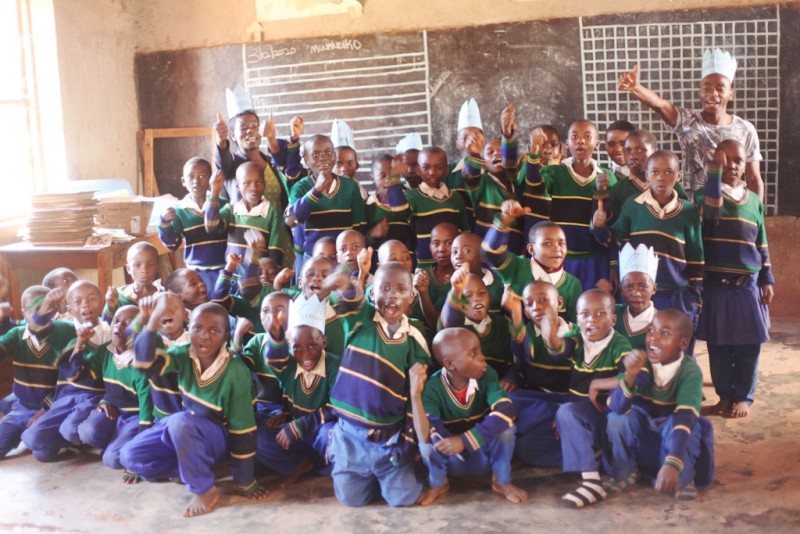 Wanafunzi wa darasa la Jifunze wakishangilia na walimu wao baada ya kumaliza kipindi chao. Darasa hili ni moja ya darasa la majaribio linaloendeshwa Shule ya Msingi Maholong’wa. |