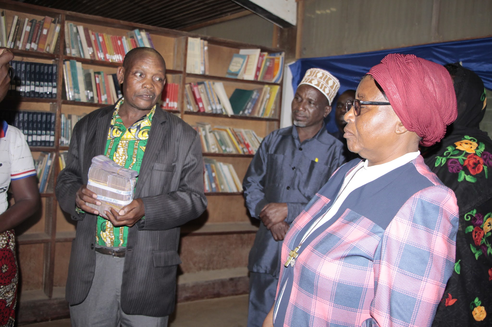 Muathirika wa Mikopo Umiza Mwalimu Mstaafu Seleman Haji, akimkabidhi shilingi milioni 46 mke wake Magdalena Gunda baada ya kukabidhiwa na Mkuu wa Mkoa wa Singida Dk .Rehema Nchimbi,