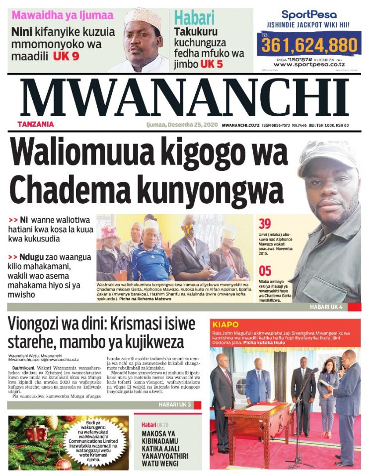 MagazetiPITIA VICHWA VYA HABARI KATIKA MAGAZETI YA LEO DECEMBER 25,2020 Last updated: 2020/12/25 at 4:28 AM joseph 5 years ago Share SHARE joseph December 25, 2020 December 25, 2020 Share this Article Facebook Twitter Email Print Previous Article MWENYEKITI WA UWT MKOA WA DODOMA, NEEMA MAJULE AELEZEA JINSI WALIVYOJIPANGA KUWEKEZA MIRADI HADI KWENYE KATA Next Article MKIRIKITI AREJESHA MALI ZA WAATHIRIKA 10 WA MIKOPO UMIZA WALIOSAIDIWA NA TAKUKURU