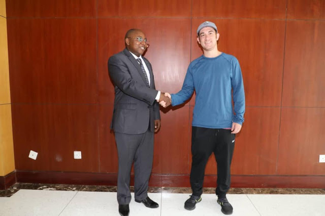 Mh Waziri wa Maliasili na Utalii Dkt Damas Ndumbaro kushoto akimpokea Drew Binsky, uwanja wa ndege wa Mwalimu Nyerere, Dar es salaam, Tanzania tarehe 27 Disemba 2020. Bw Drew ambaye anawafuasi zaidi ya 30 milioni kwenye mitandao ya kijamii na mkewe Diana wanatembelea vivutio vya utalii Tanzania.