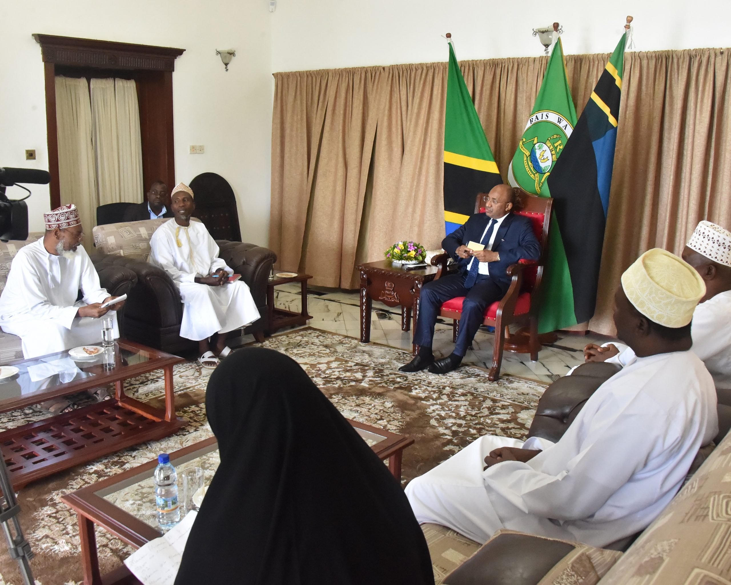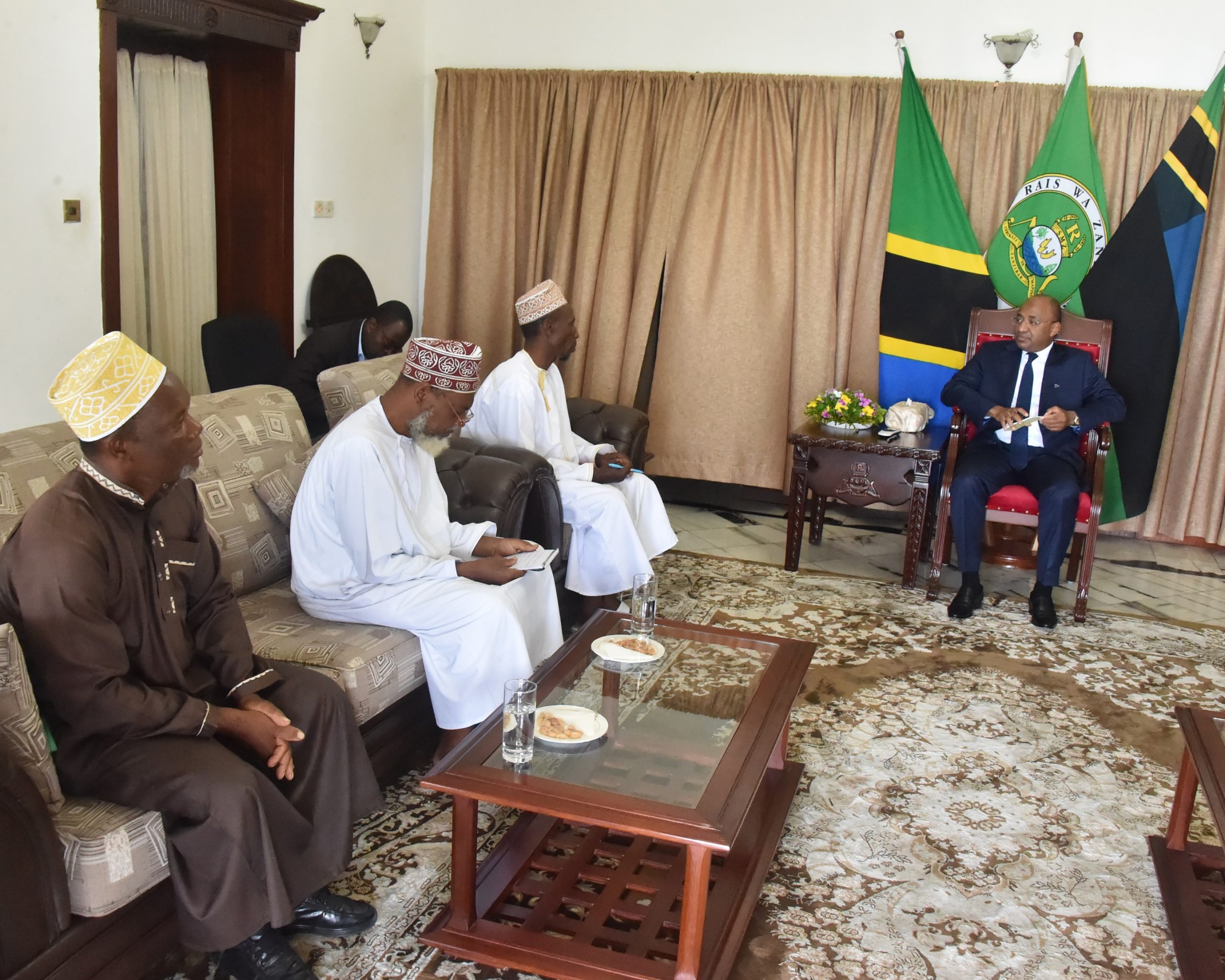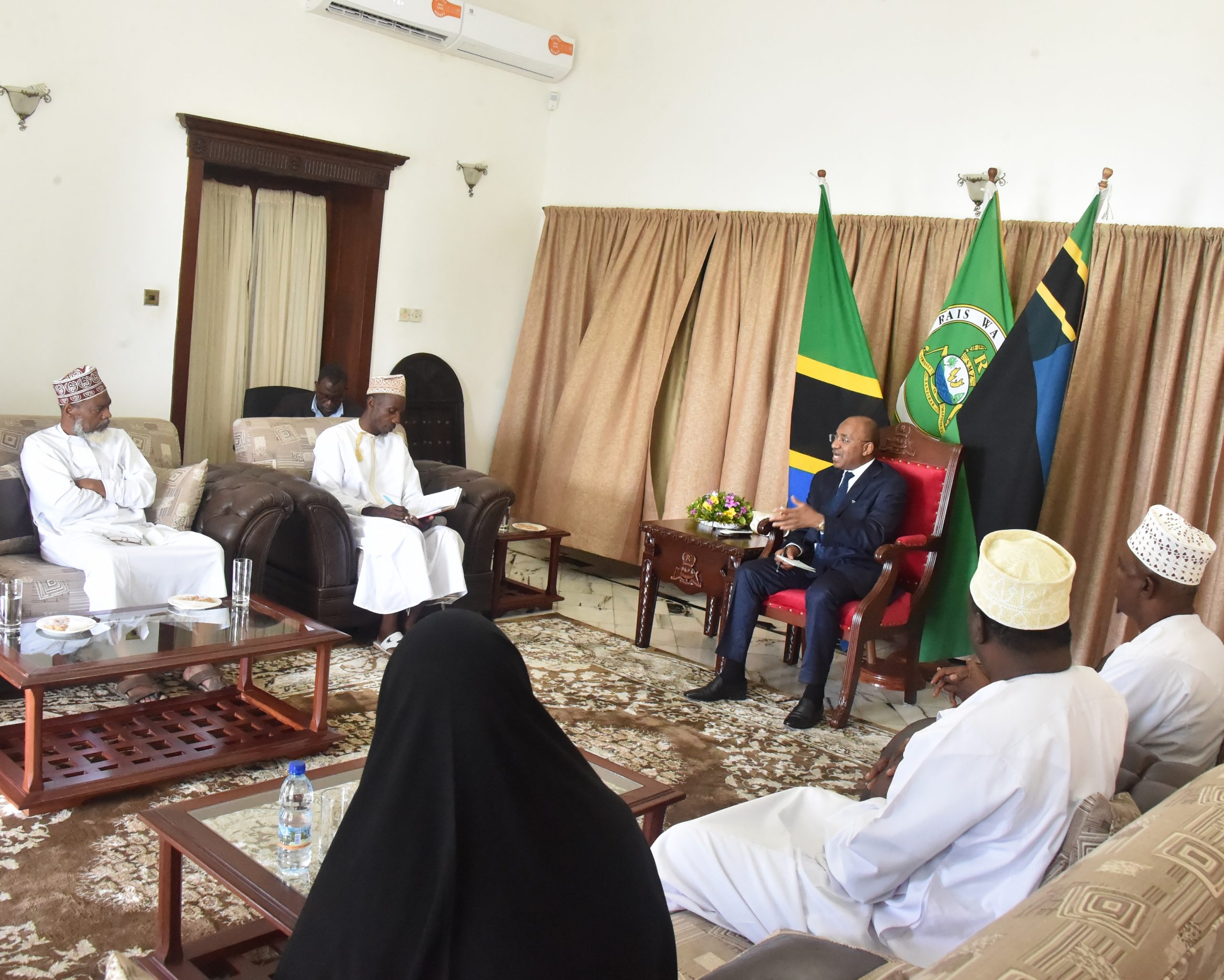 Rais wa Zanzibar na Mwenyekiti wa Baraza la mapinduzi Dk.Hussei Ali Mwinyi (katikati) akiwasikiliza Uongozi wa Jumuiya ya Jumuiya ya Maimamu (JUMAZA) wakati wa mazungumzo yao Ikulu Jijini Zanzibar leo waliofika kumpongeza kutokana na ushindi alioupata katika uchaguzi Mkuu uliopita Mwaka 2020.[Picha na Ikulu] 28/12/2020.