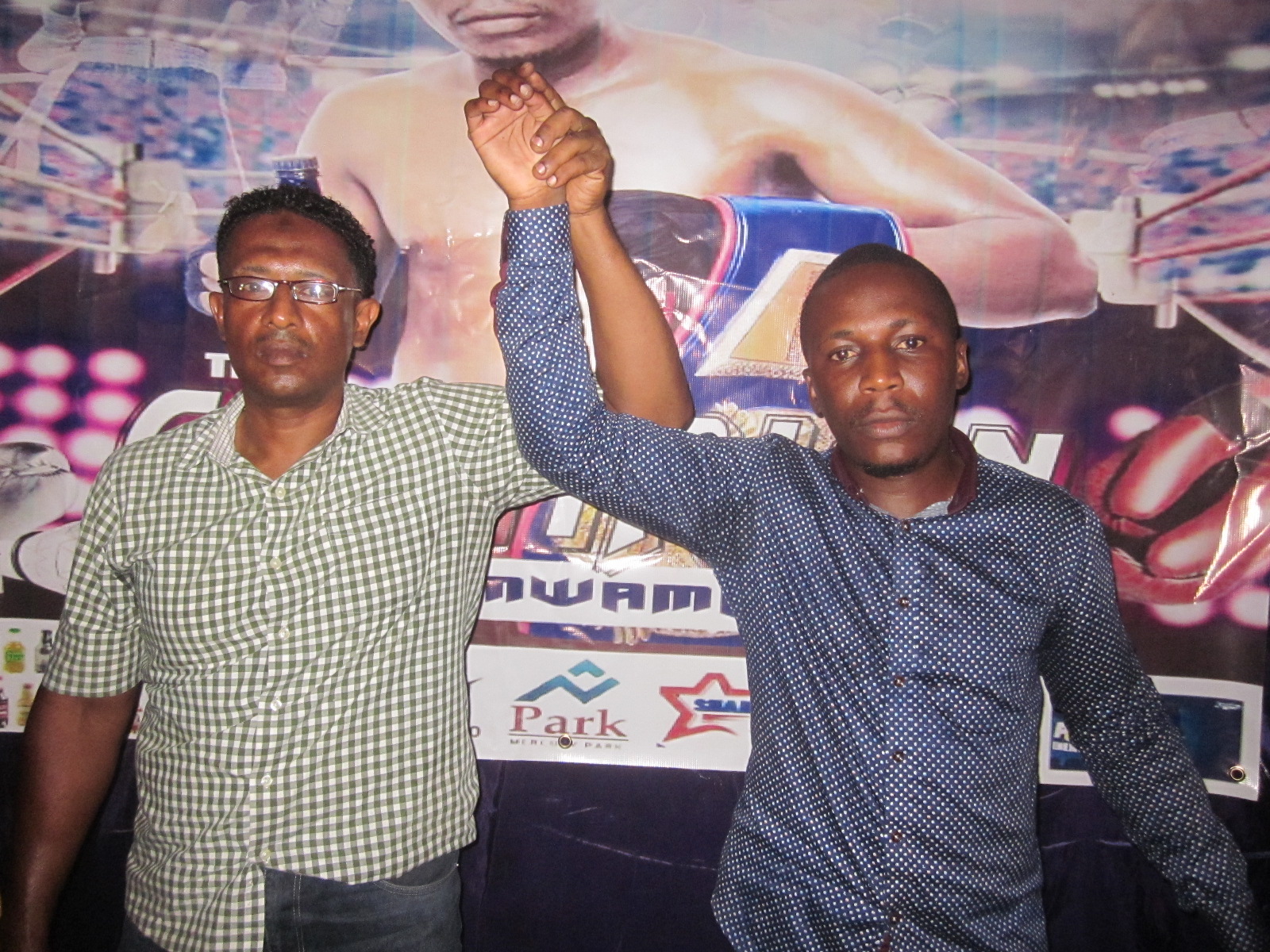 Kocha wa mchezo wa masumbwi na mateke /kicki Boxing Esmail Abdallah ‘Van Dame’ kushoto akimwinua mkono juu bondia Amosi Mwamakula kwa ajili ya kumtambulisha katika mpambano wake wa kuzipiga Feb 6 katika ukumbi wa P.T.A Sabasaba na Hashimu Kilaga