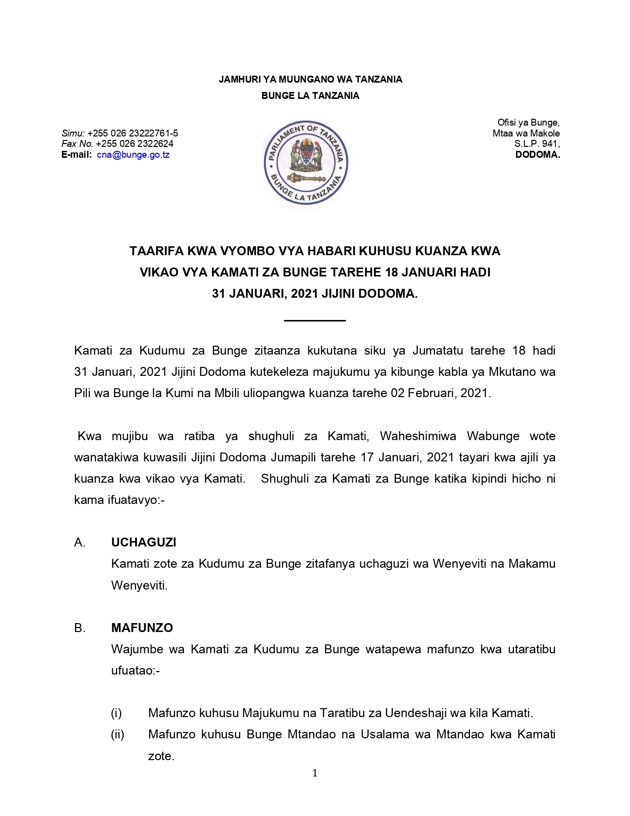 SiasaTAARIFA KWA UMMA KUHUSU KUANZA KWA VIKAO VYA KAMATI ZA BUNGE TAREHE 18 HADI 31 JARUARI 2021 JIJINI DODOMA Last updated: 2021/01/13 at 9:36 AM Alex Sonna 5 years ago Share SHARE Alex Sonna January 13, 2021 January 13, 2021 Share this Article Facebook Twitter Email Print Previous Article Wavuvi na Wakazi wa Kijiji cha Nyamikoma Wapewa Elimu ya Ufugaji wa Samaki kwa kutumia Vizimba Next Article MAAFISA UGANI WATAKIWA KUTOA ELIMU YA KILIMO BORA CHA MAZAO YA BIASHARA KWA WANUFAIKA WA TASAF